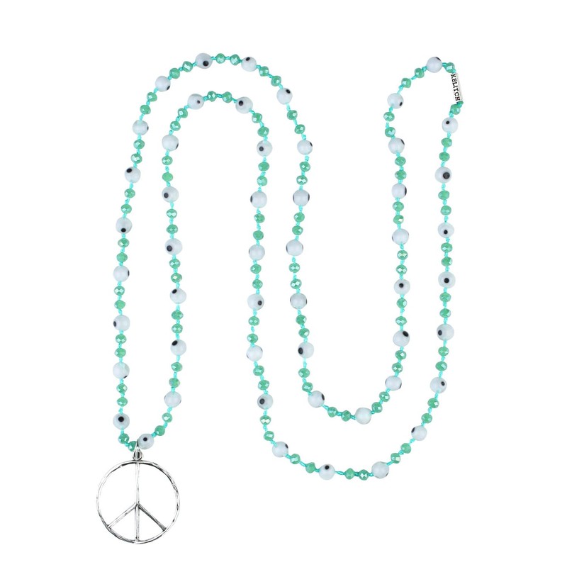 - Length: 34", Crystal bead size: 4 Mm, Eye ball size: 6 mm, Peace sign pendant: 1.4