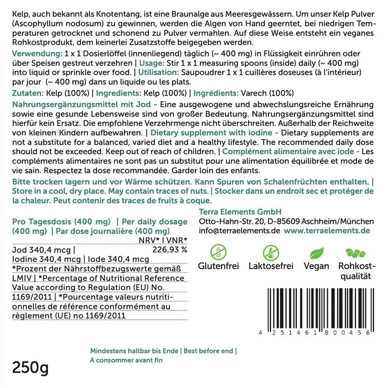 The brown algae Kelp is characterised by its high content of natural iodine. For our Kelp powder, algae from wild growth are used, which are harvested by hand. They are then gently dried and finely ground. No additives or temperatures above 42 degrees Celsius are used. This creates a 100% pure, vegan natural product, which is a valuable addition to food and drinks. Notes: Dietary supplements are not a substitute for a varied and balanced diet and a healthy lifestyle. Do not exceed the recommended dose. Keep out of reach of small children.