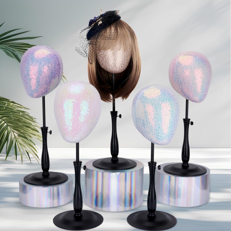 - 3. Professional Design:This Shining sequins manikin head block is designed in the shape of a human head with a dynamic, fashionable egg-shaped face and a stable round base.