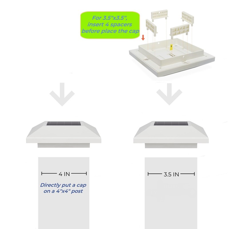 - Fit for 4x4 Posts: Solar cap light measures 5.52 x 5.52 x 1.67 inches. It can be mounted on 4x4 (actual 4x4) inches vinyl post or 4x4 (actual 3.5x3.5) inches wooden post.