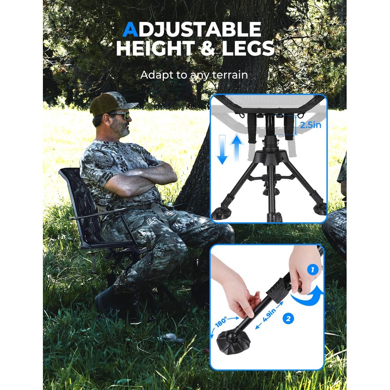 - Sturdy & Stable - The hunting seat is made of powder-coating steel without rusting and can be used at low temperatures. Adjustable leg and four swivel feet ensure a steady position on uneven terrain and prevent sinking. Stay comfortable even when sitting for hours.