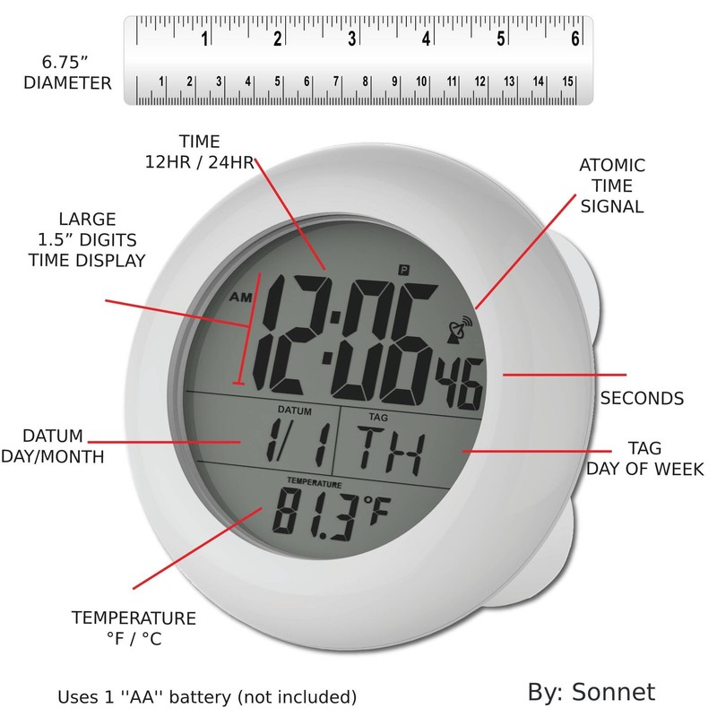 - EASY TO SEE - The Sonnet Bathroom Clock has a large 4.5" Diameter LCD Display makes it easy to read the time from anywhere. The (Time is 1.5" high). Shows the Time (24/12hr), Date (Datum: Day/Month), Day of the Week (Tag) and Temperature (F/C)