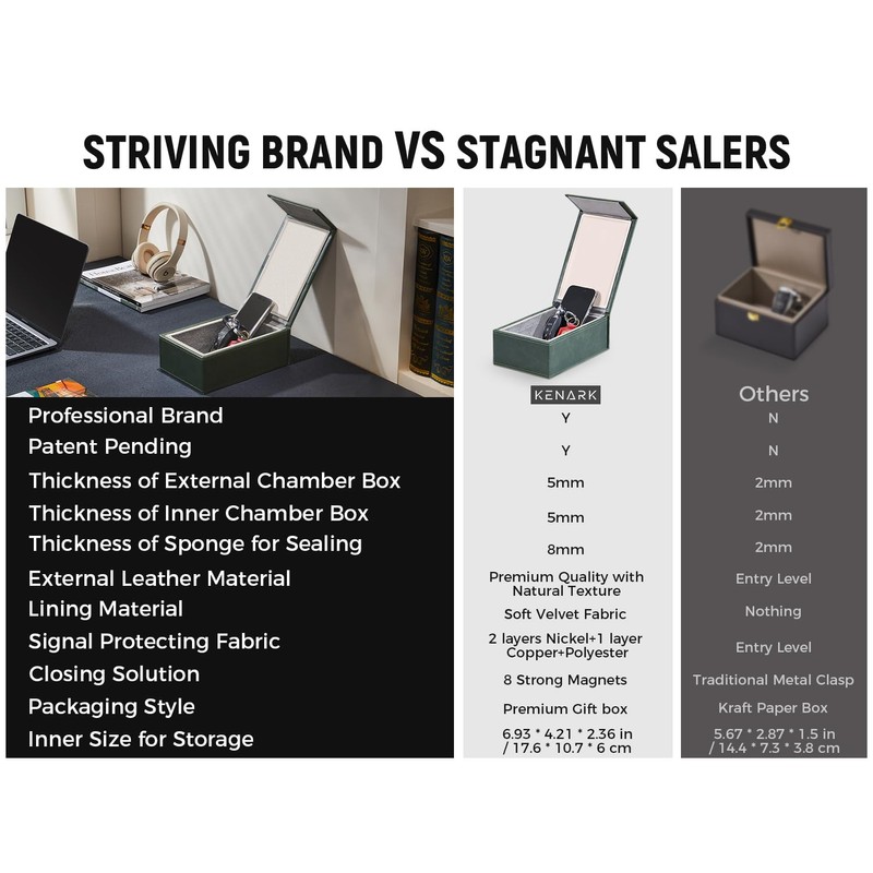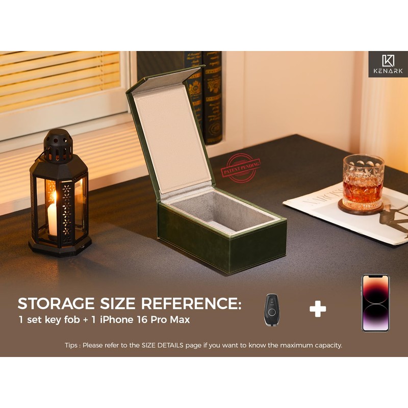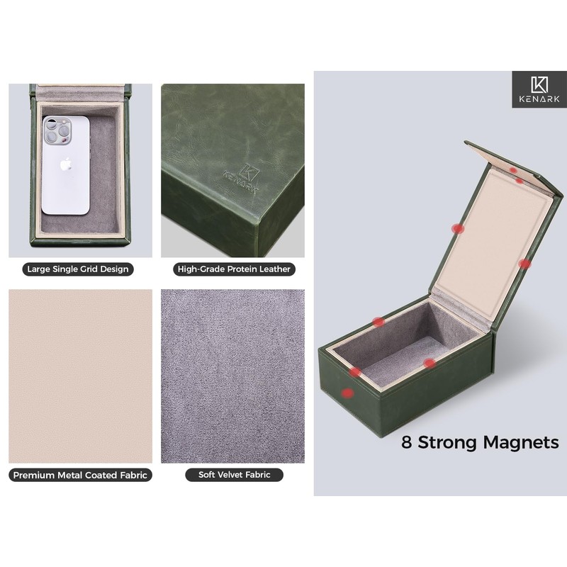 - PREMIUM MATERIALS AND CRAFTSMANSHIP: Crafted from premium protein leather and lined with soft velvet, the KENARK Faraday Box combines luxury with functionality. Its reinforced high-strength board and 8 powerful magnets ensure maximum durability and signal-blocking efficiency, while over 30 meticulous hand-crafted processes, including precision stitching, reflect our unwavering commitment to quality. This sophisticated key fob protector not only secures your devices but also enhances your lifestyle with its refined design.