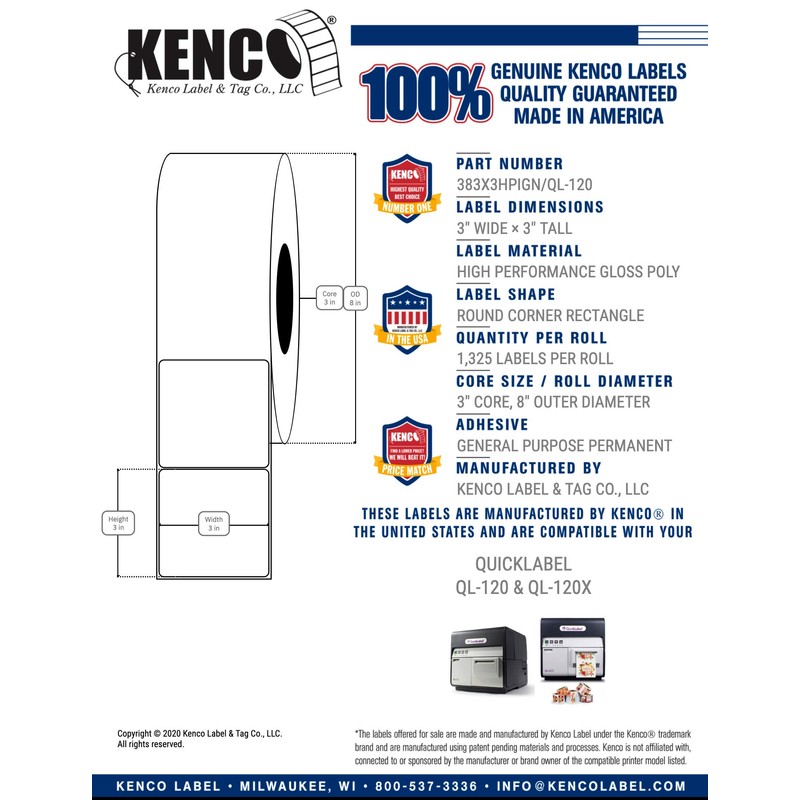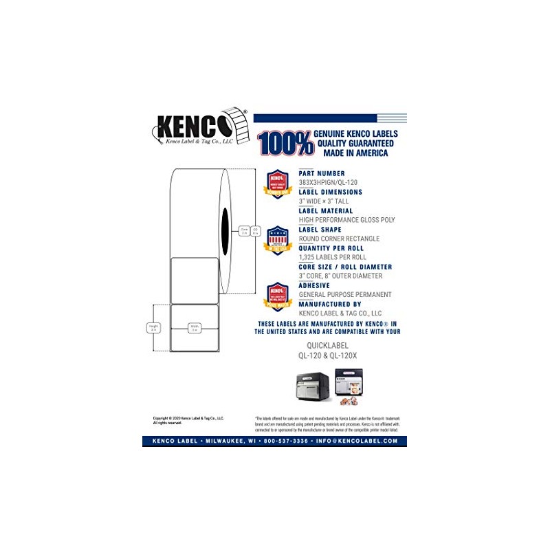 Kenco Premium 3" X 3" High Performance Gloss Poly Roll-Fed Inkjet Labels. Compatible with QuickLabel QL-120 & QL-120X Printers. 1,325 Labels per Roll on a 3" Core and 8" Outer Diameter.