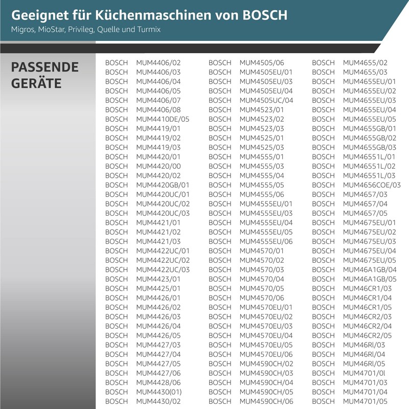 • Replaces original part number: 00091027. The blade is suitable for the Bosch food processor MUM4/MUM8 series and is the suitable replacement for the models MUZ4DS2 and MUZ4DS3.