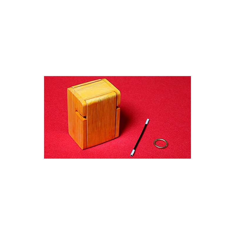 A brass ring is placed on the floor of a small wooden box. The front and back doors of the box are closed. A mini magic wand is placed in the slotted holes existing on the side walls of the box with the ends of the wand protruding outside the box. The performer makes magical passes around the box, then takes out the wand and there comes the surprise. The ring is found to be trapped on the wand! Both doors of the box are open thus showing clearly that there isn't a duplicate ring.