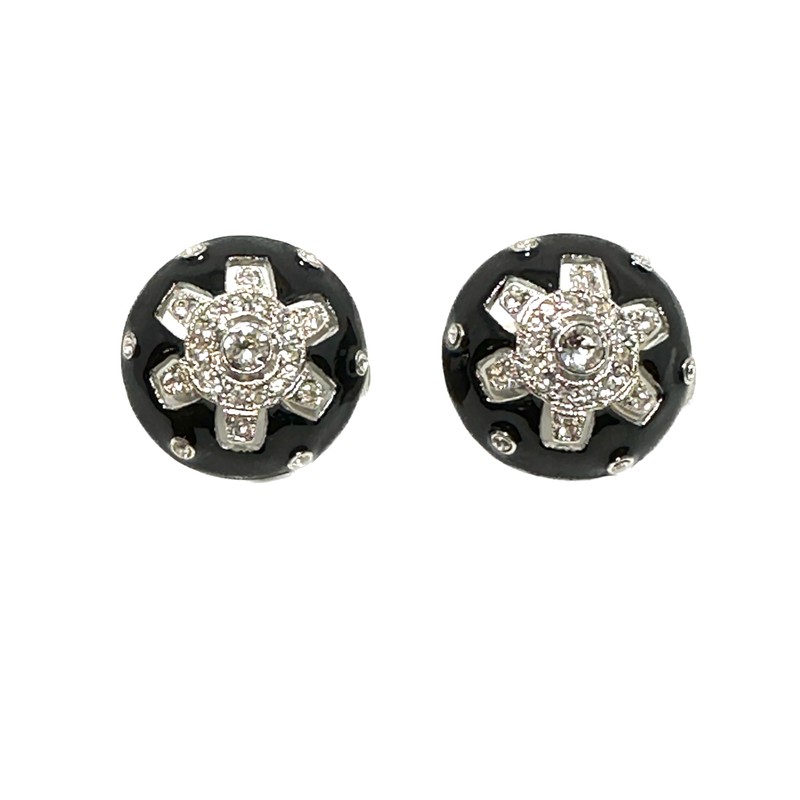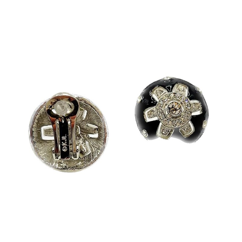 Kenneth Jay Lane, Black Enamel Clipe earrign with silver/crystal shield shape center, Dimensions: 1.25"