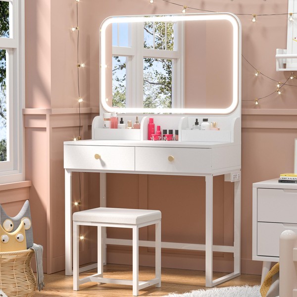 Keonjinn White Vanity Desk with Mirror and Lights, LED Makeup Vanity Desk with 2 Large Drawers & 2 Makeup Trays & Chair, 7000 Lux Vanity Set with Light and Power Outlet, 32" W Vanity Table with CRI>90
