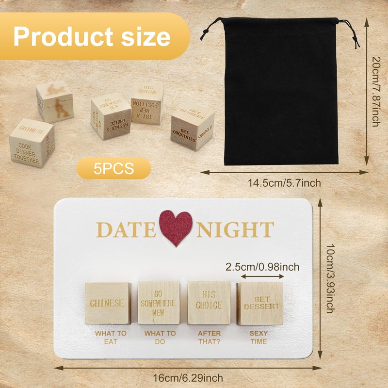 • The package includes: the date night cube set presents 5 cubes in different styles, 1 black mini drawstring bag, a wooden tray.