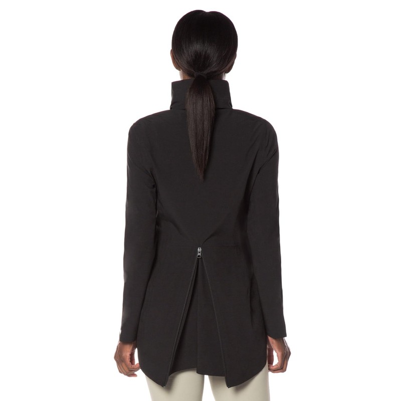 - Split-back equestrian shaped hem zips open for in-saddle coverage and performance