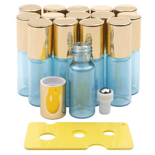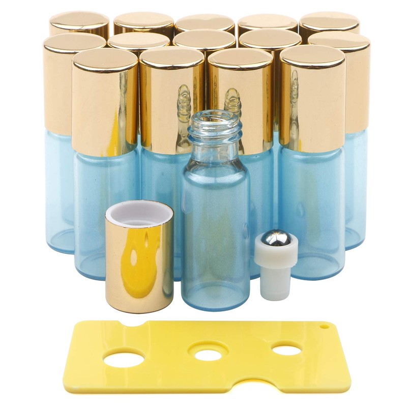 Kesell - Lote de 15 botellas de vidrio con rodillo de acero inoxidable y tapas doradas (5 ml), color azul claro