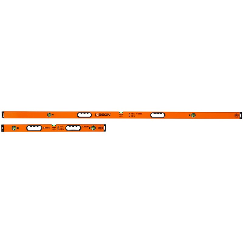 Keson 32" And 78" Box beam level set. The levels offer a strong aluminum profile (860 g/m strength) with 2 Shock-absorbing end caps to protect the level in case of a fall or shock. End caps are equipped with an anti-slip surface, allowing for convenient positioning and a secure grip to the measuring surface. The break-resistant acrylic block focus vial with 20% magnification also offer a luminous backing for low light conditions. The vial fluid is not affected by electricity and will not fade under sunlight. Accuracy of the level: ≤0.0005 in./In. (0.5 mm/m). 2 ergonomically designed handholds provide a comfortable grip. Made in Austria.