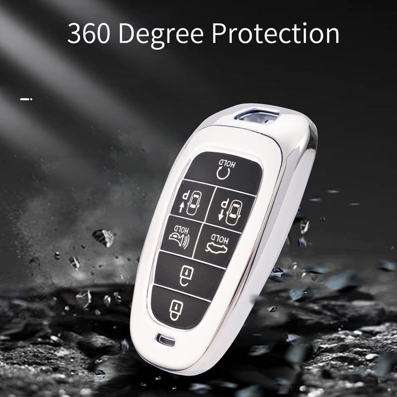 Kespevn for Hyundai Key Fob Cover 7 Button with Leather Keychain Soft TPU 360 Degree Protection Car Key Case Shell Holder Fits for 2023 2022 2021 2020 Hyundai Sonata Santa fe Tucson, Silver