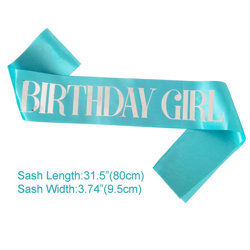 Color: teal blue sash with foil silver lettering "BIRTHDAY GIRL"