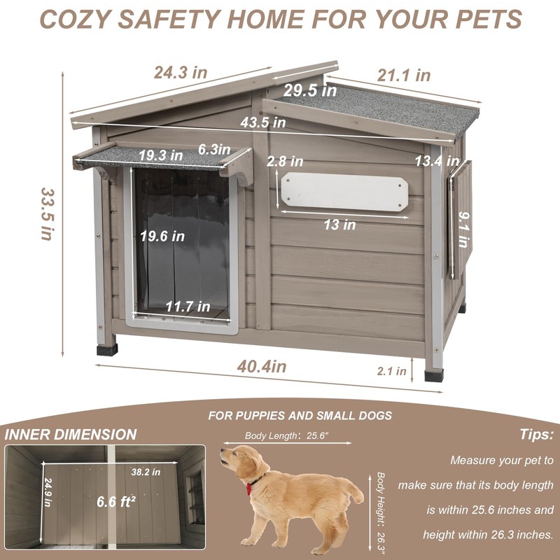 - 【Pet House Dimensions】Overall Dimensions: 43.5" L x 29.5" W x 33.5" H. Interior Dimensions: [38.2" L x 24.9" W x 28.9" H]. Available in medium and large sizes, suitable for medium dogs up to 30 lbs. The included manual identifies each screw and accessory, with pre-drilled holes for quick and easy assembly. Our customer support team is available to answer any questions. Built to withstand your pup's instincts, this durable dog house offers peace of mind.