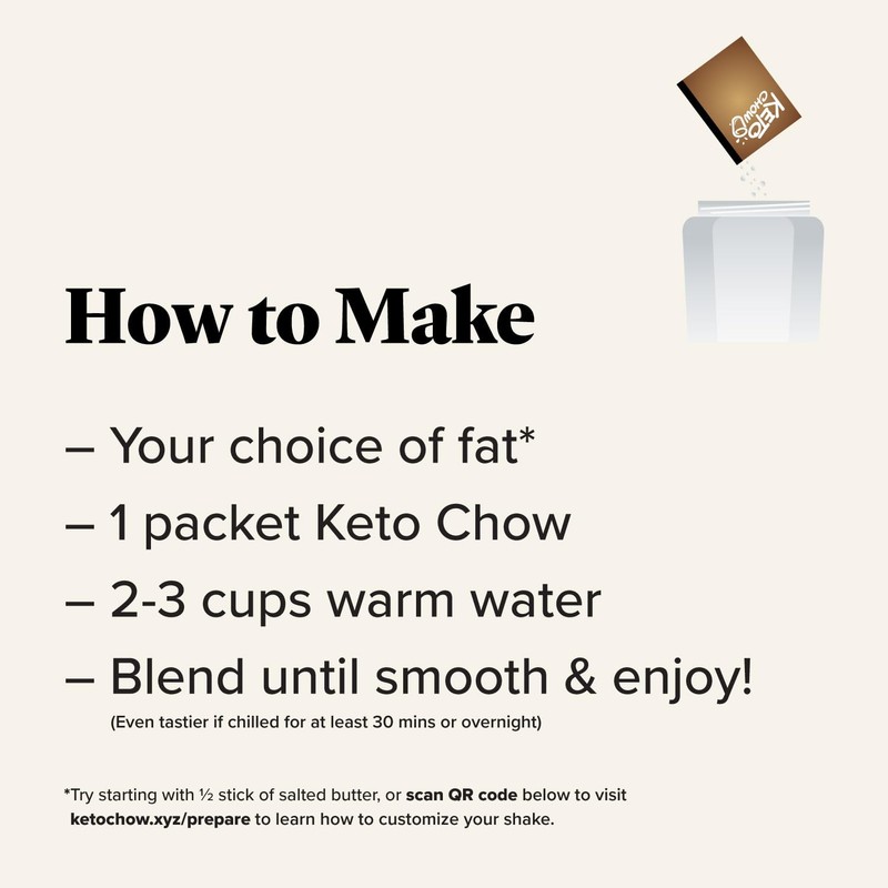 - Meal Prep - Our Keto Shake Meal Replacements are the perfect solution for those wanting to make keto meal prep easy. Keto Chow was designed to serve as a delicious keto meal that keeps you in nutritional ketosis. Drink “As Is” or use as an ingredient for any number of keto recipes! Unsweetened.