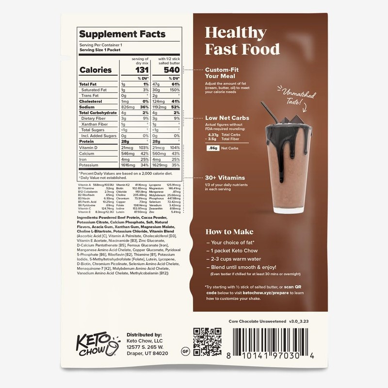 Keto Chow Chocolate Core (Unsweetened) - Keto Meal Replacement Shake Powder - Nutritionally Complete - Low Carb - Delicious Easy Meal Substitute - Protein Rich & Dairy Free - Single Meal Serving