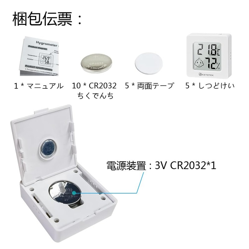 - 【What You Get】Package Includes: 5 x Thermohygrometer, 10 x CR2032 batteries(5 of them already installed in the thermometer), 5 x Wall Stickers, 1 x User Manual. By default, the thermometer/hygrometer is off. So you don't have to worry about running out of battery during shipping, just long press the power button, and you can use the thermometer as soon as you receive the package