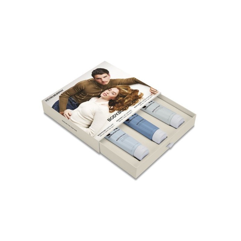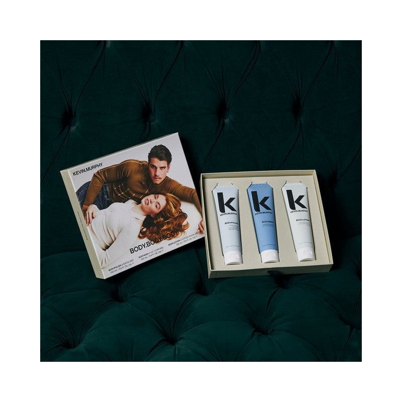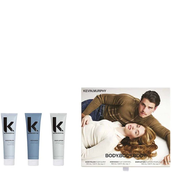 The Kevin Murphy Body Body Body Trio Pack is a limited edition curated trio of rich BODY.WASH, BODY.POLISH, and BODY.LOTION that nourishes, hydrates, and restores the skin's appearance with a signature KEVIN.MURPHY scent of SEYAH.NOIR.