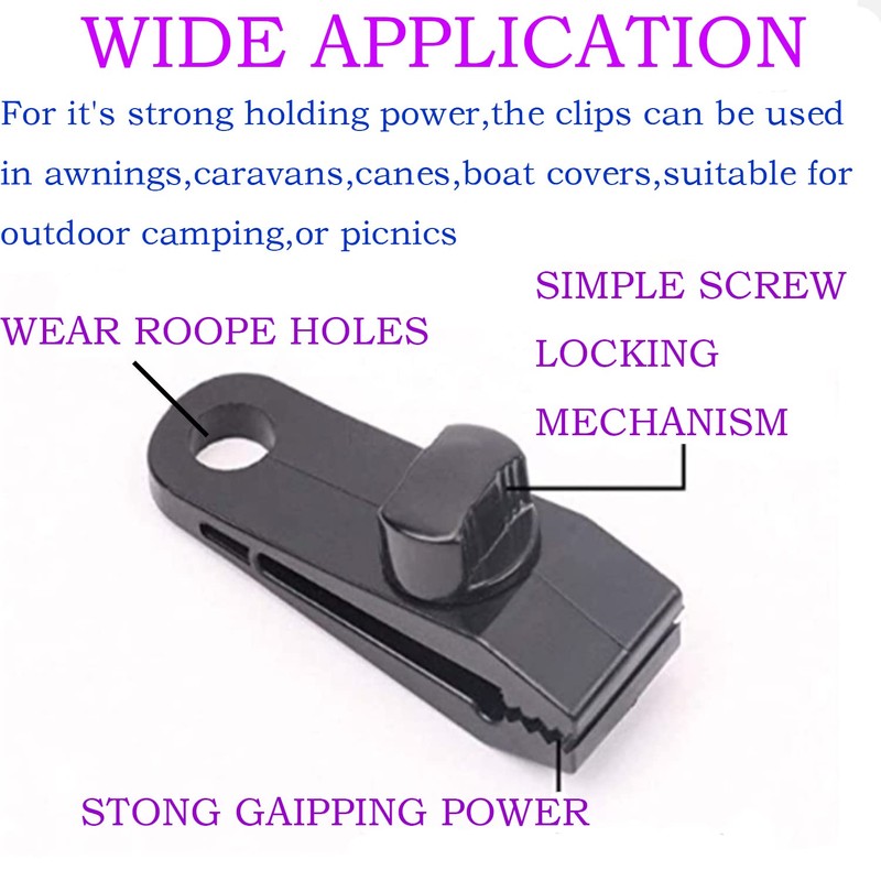 - Widely used: Clamp clamps are ideal for outdoor camping tents, awnings, caravans, tarpaulins, canvas, awnings, boat covers, swimming pool covers, temporary shelters or any fabric covering that requires additional support points