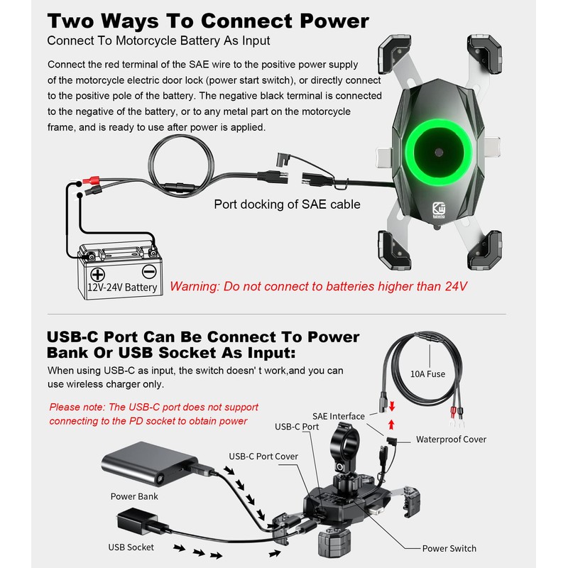 - Two Ways to Get Power: You can use the SAE harness to connect the phone holder to the motorcycle electric door lock or battery to get power, The motorcycle cell phone mount can also be connected to the USB port with fast charging protocol to obtain power through the USB harness