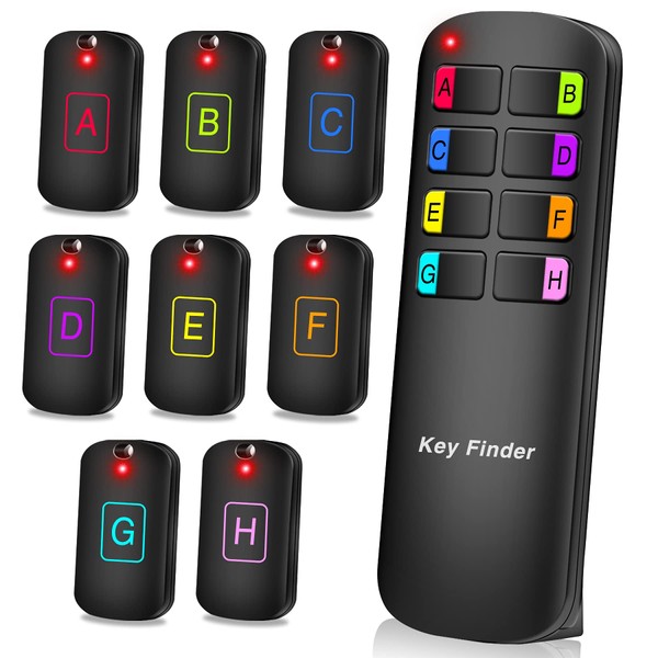 • 8-in-1 Finder / One-Touch: The transmitter (1) of the key finder has a receiver button in 6 different colors, and the receiver (8) is the same color as the button on the transmitter. A loud beep sound and a red LED flashes to quickly find lost items
