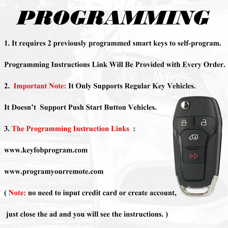 - PROGRAMMING: It requires 2 previously programmed smart keys to self-program. Self-Programming Instructions Link Will Be Provided with Every Order.