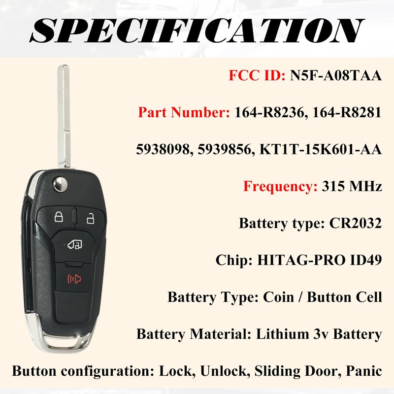 - REPLACEMENT: This Keyless Entry Remote Control Car Key Fob Replacement Is Compatible with Part Numbers: 164-R8236, 164-R8281, 5938098, 5939856, KT1T-15K601-AA.
