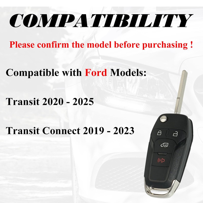 - COMPATIBILITY: Compatible with FCC ID N5F-A08TAA. Please Check Our Product Description and Vehicle Fitment Tool for Full Compatible Vehicles List. This Remote Key Fob Replacement Is Compatible with Ford Transit 2020-2025, Ford Transit Connect 2019-2023.