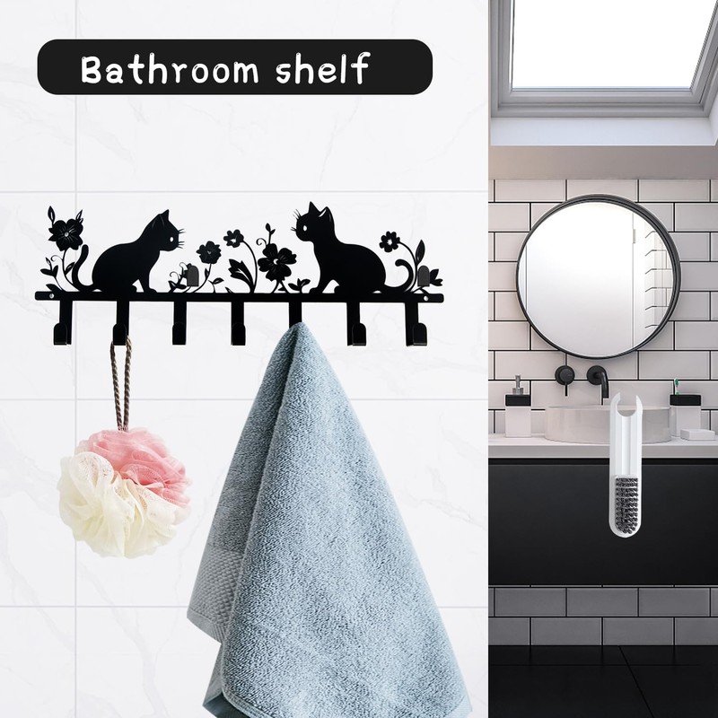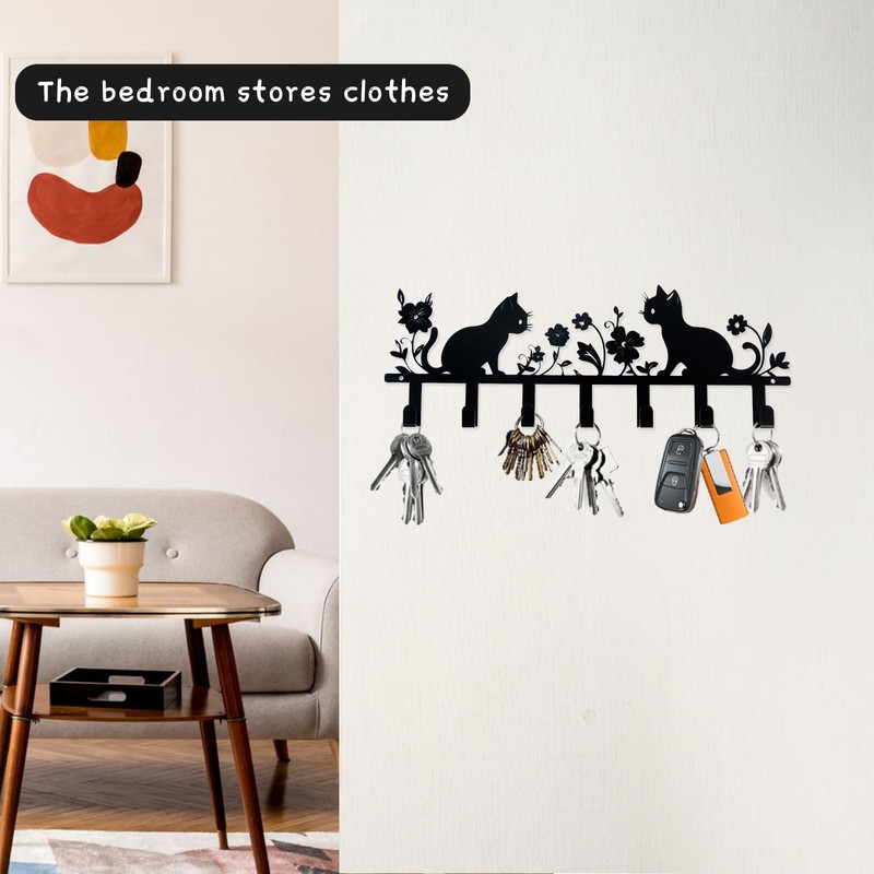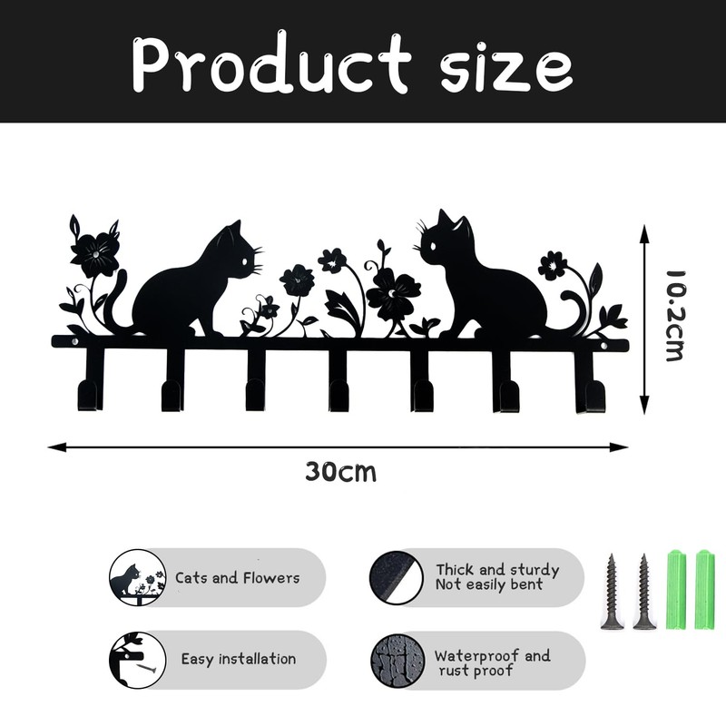 Key Holder, Key Holder, Black, Cat Key Holder, Wall Key Holder with 7 Hooks, Metal Key Hanger for Hallway, Entrance, Living Room, Kitchen, Key Rack