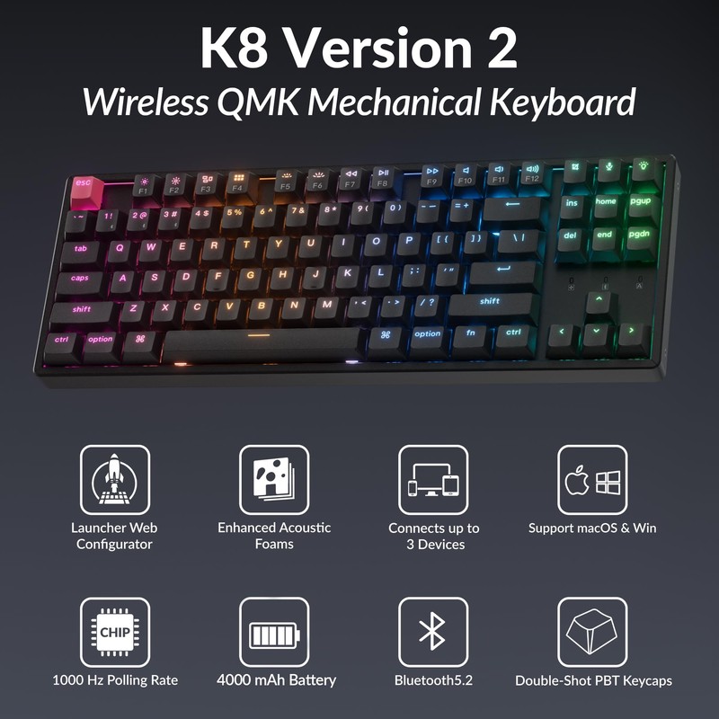 - The K8 Version 2 is a wireless mechanical keyboard with a classic TKL (80%) layout that expertly balances portability and functionality. It supports Bluetooth 5.2 and wired connections, making it perfect for work and gaming on macOS, Windows, and Linux. Enhanced with acoustic foams for a quieter experience, it offers limitless customization via QMK and the Keychron Launcher web app.