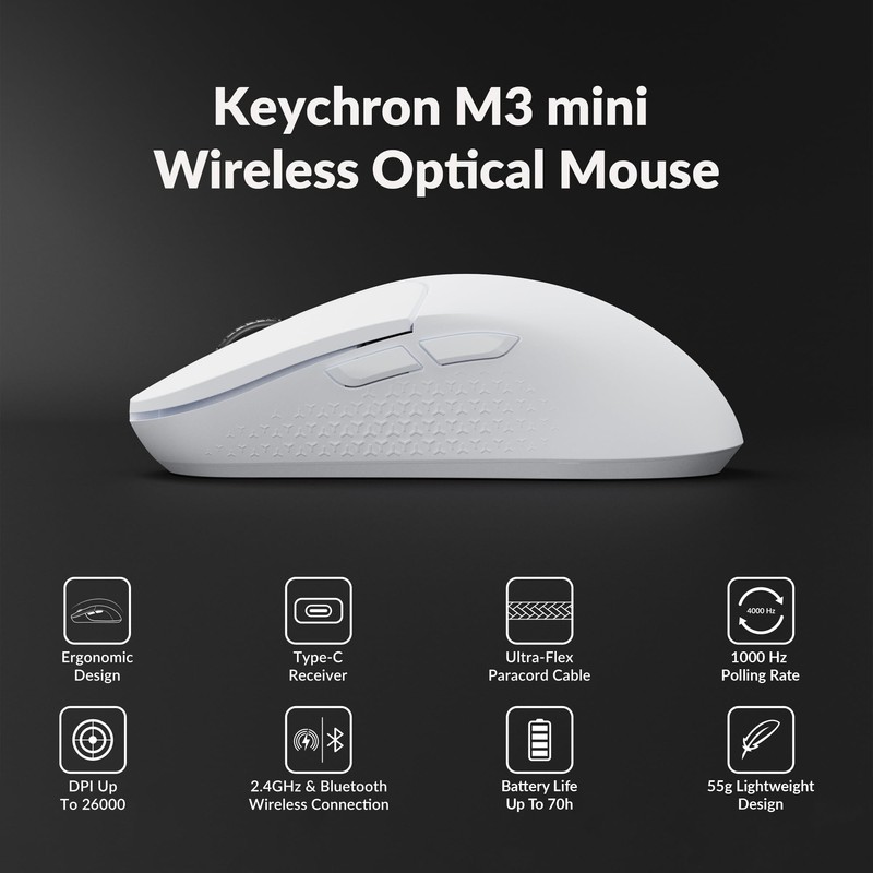Keychron M3 Mini Wireless Optical Mouse, Bluetooth 5.1/2.4 GHz/Wired Gaming Mouse, Programmable PixArt 3395 Sensor with up to 26,000 DPI/ 650 IPS, Lightweight Ergonomic for Windows Mac Linux - White