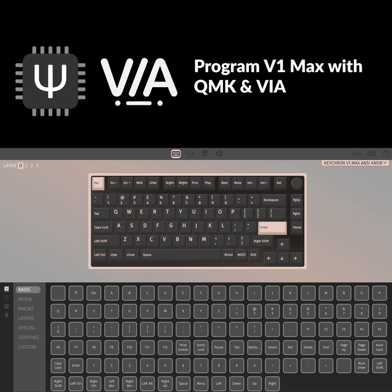 - Program any key with QMK/VIA - QMK / VIA is open-source software for keyboards that allows anyone to easily program and remap each key or macro (incl. the knob) on macOS, Windows, or Linux. Please download the appropriate keymap JSON file, open VIA, turn on "Show Design tab" on "Settings" tab, and drag the JSON file into the “Design” tab on VIA to get the V1 Max keymap working on VIA.