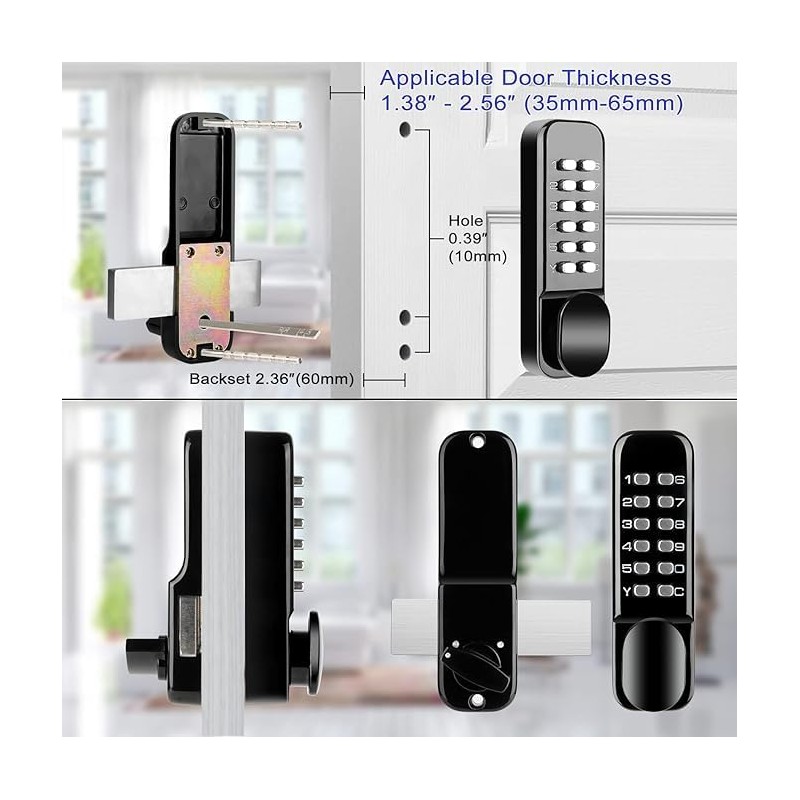 - ใApplicable DoorsใKeyless entry door lock works with both left and right handed doors due to adjustable unlocking direction. And also suitable for indoor or outdoor wooden doors, aluminum alloy doors, wrought iron doors with 1.38 inches to 2.56 inches (35mm-65mm) thickness. Accessories can be shortened according to the actual thickness of the door. Before purchase, please confirm whether this door lock is suitable for your door thickness and the holes drilled before.