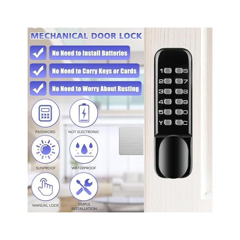 This keyless entry door lock adopts 100% mechanical principle, no battery operation, more assured. Reject bad programming and random alerts.