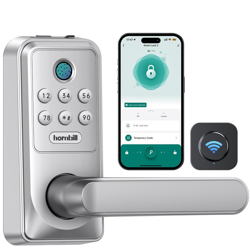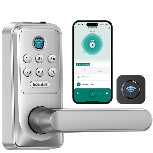 - Multi-Function WiFi Lock: Hornbill smart Lock with handle has fingerprint, "Smart Life App", password, bluetooth, and WiFi unlocking methods to provide you with more choices. It also features auto-lock, anti-theft alert and more. Privacy lock and anti-theft code mode ensure your property safety. Suitable for exterior doors, bedrooms in homes, resorts, Airbnb apartments.