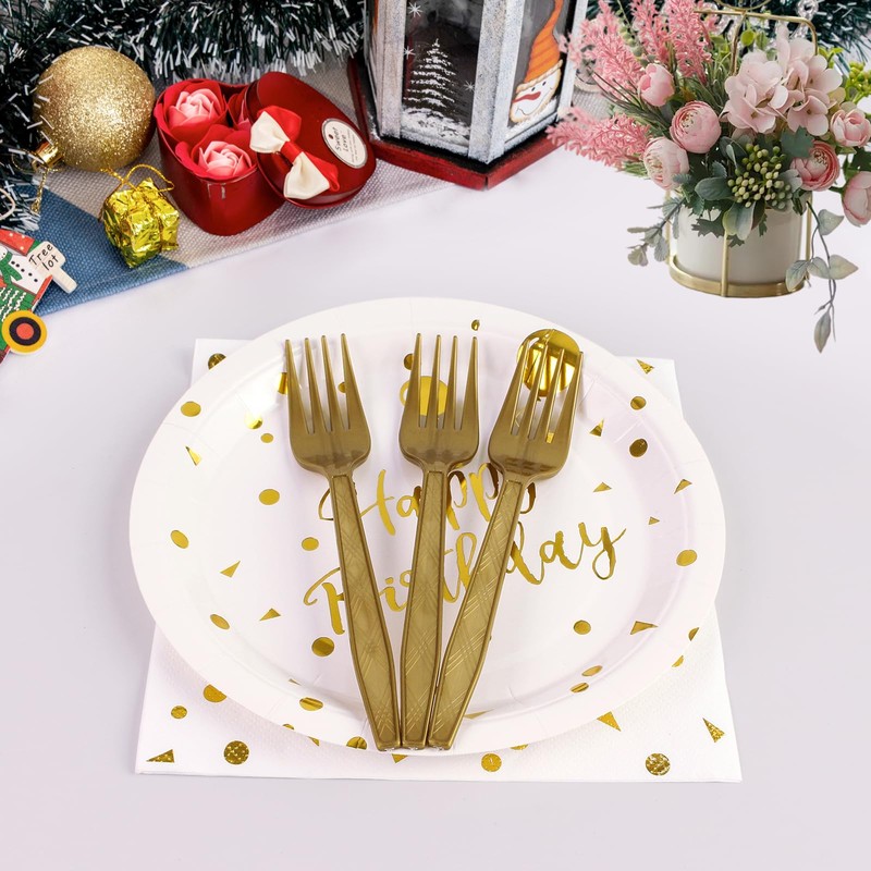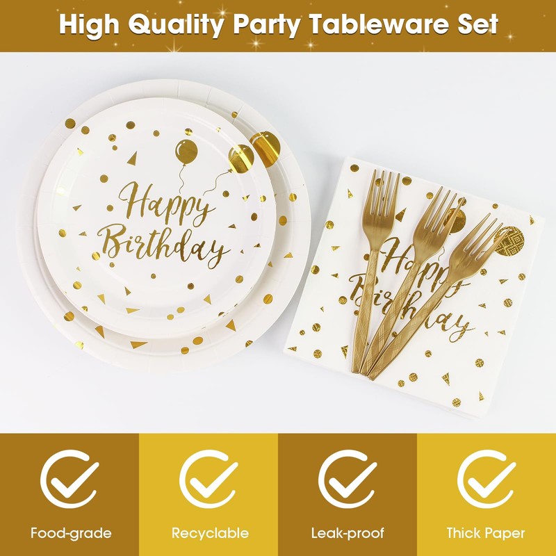 - Birthday Party Paper plates Napkins sets: Our Birthday Party Decorations Dinnerware Set includes 24pcs of 9" white gold dinner plates, 24pcs of 7" white gold dessert plates, 24pcs of 6.5" white gold napkins and 24pcs forks, serving up to 24 guests.