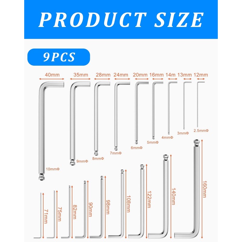 - [Maintenance and Assembly Tools] 9 pieces hex keys for tightening or loosening hex screws, different models from 1.5mm to 10mm can be used for complex and difficult mechanical maintenance work.