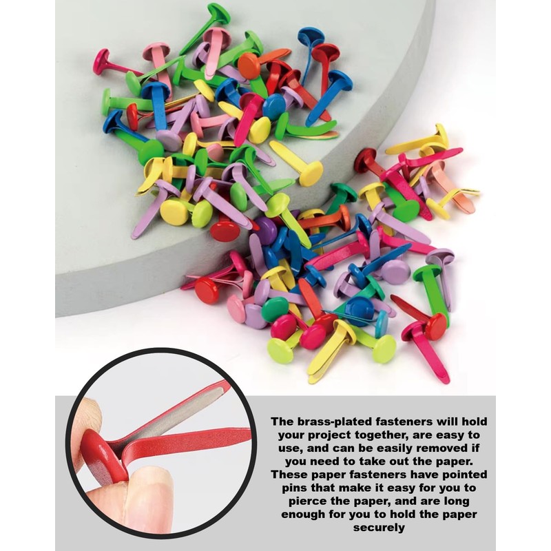 - 100 PCS PAPER BRASS FASTENERS A set of 100 colorful mini nails, abundant for reuse. Make sure you always have mini brake fasteners on hand when you need them, and keep a few just in case. Metallic brass brad nails are great for classroom work, office supplies, artwork, party stationery and everyday home projects. Keep some of them in your office, home!