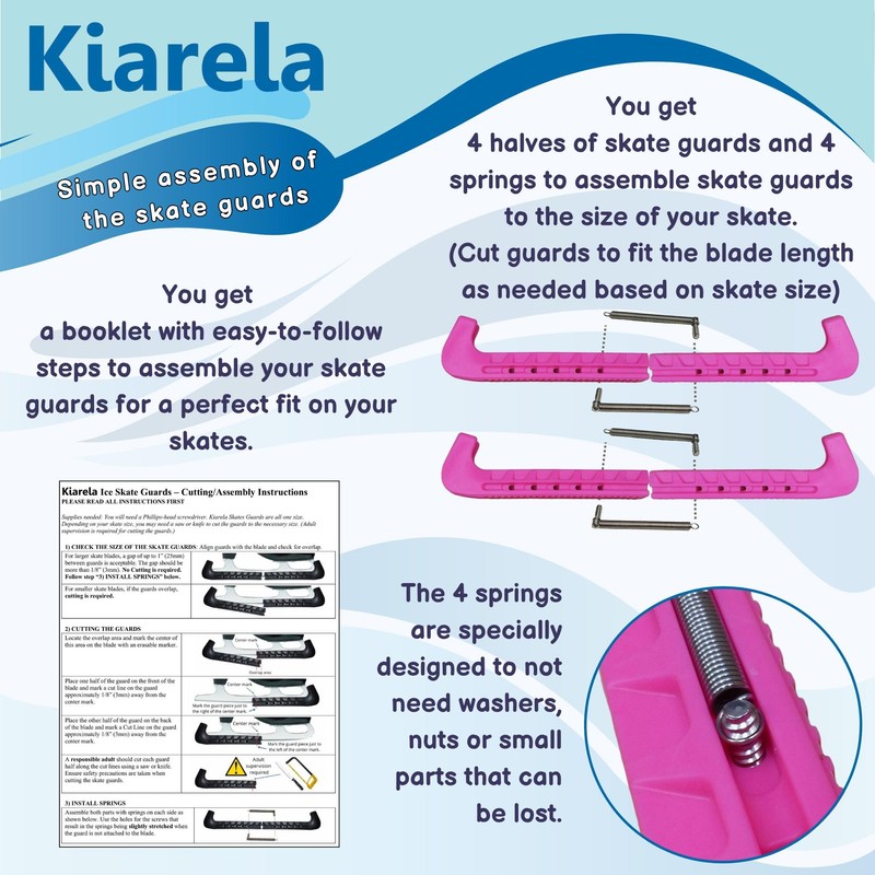 - EASY ASSEMBLY: The skate guards come in four plastic pieces with springs and Phillips-head screws for easy assembly. Depending on your blade size, the pieces may need to be trimmed for a perfect fit. Detailed instructions for cutting are included.