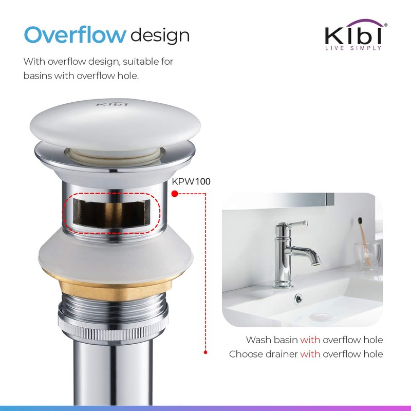 KIBI Bathroom Sink Pop-Up Drain with Overflow | Small Cover Design Vanity Drain Stopper for Lavatory Sinks | Durable Solid Brass Construction, Corrosion-Resistant Finish (Ceramic White, KPW100)