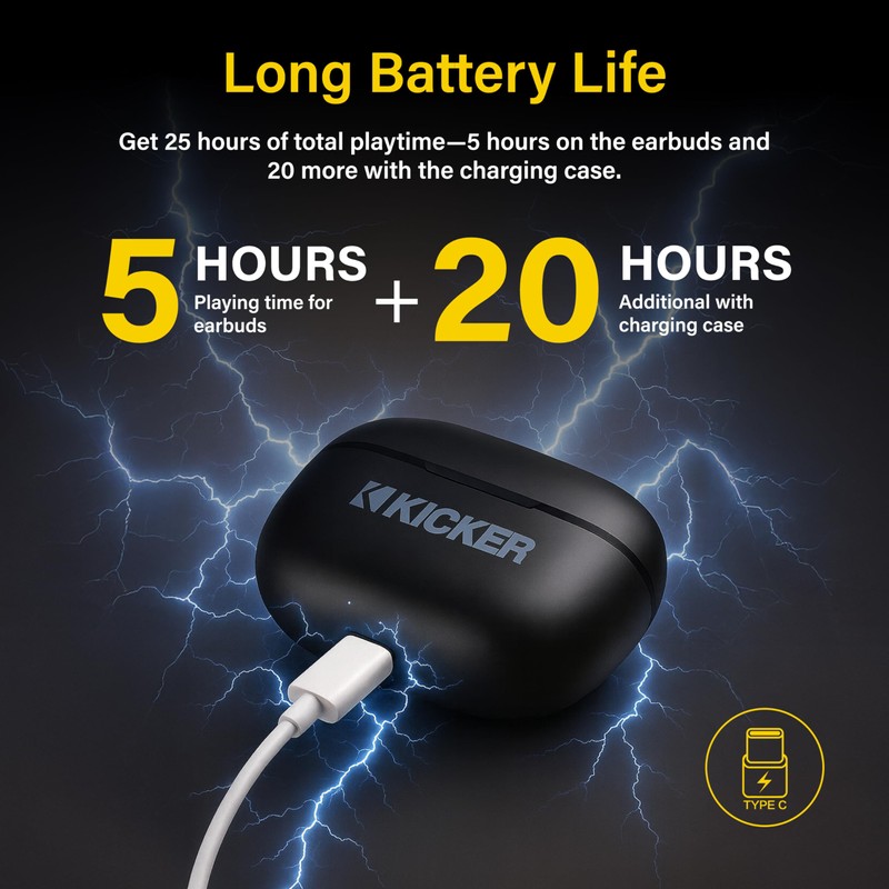 Enjoy rich sound anywhere with our Kicker Bluetooth Earbuds. KICKER brings concert-like tuning to a comfortable design that travels easily. Hybrid noise-cancelling earbuds reduce distractions by up to 35 dB, so music, podcasts, and calls stay clear. Transparency mode keeps you aware of traffic, announcements, and quick chats when you need them. Dual microphones with environmental noise cancelling pick up your voice clearly and limit background noise in busy streets or echoey rooms. You get dependable power for the day. A single charge delivers up to 5 hours of play time, and the recharging carrying case adds 20 more for a total of 25 hours. IPX4 sweatproof protection helps these sport earbuds handle rain, splashes, and workouts. The secure earbud & in-ear headphones design feels light yet stable, so you can move without adjusting. These workout earbuds match your pace at the gym or on the track. Touch sensor controls keep listening simple. You can play or pause, skip tracks, answer calls, and switch between noise-cancelling ear buds and transparency with quick taps. These Bluetooth earbuds connect quickly to phones, tablets, and laptops for music, shows, and calls, with a stable signal as you move. Three sizes of soft rubber eartips let you find a comfortable seal for better sound and isolation. The case slips into a pocket for easy carrying and protects the buds between uses. You get a USB-C charging cable plus a Quick Start Guide and User Manual, so setup is quick. Get your Kicker Bluetooth Earbuds today and enjoy clearer calls, deeper immersion, and a fit that keeps up with your day.