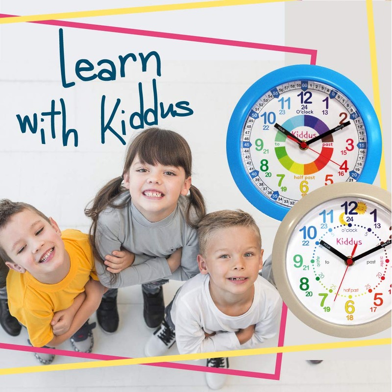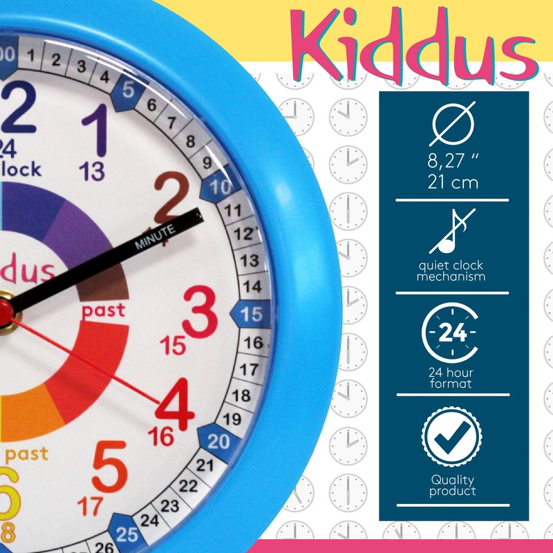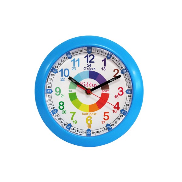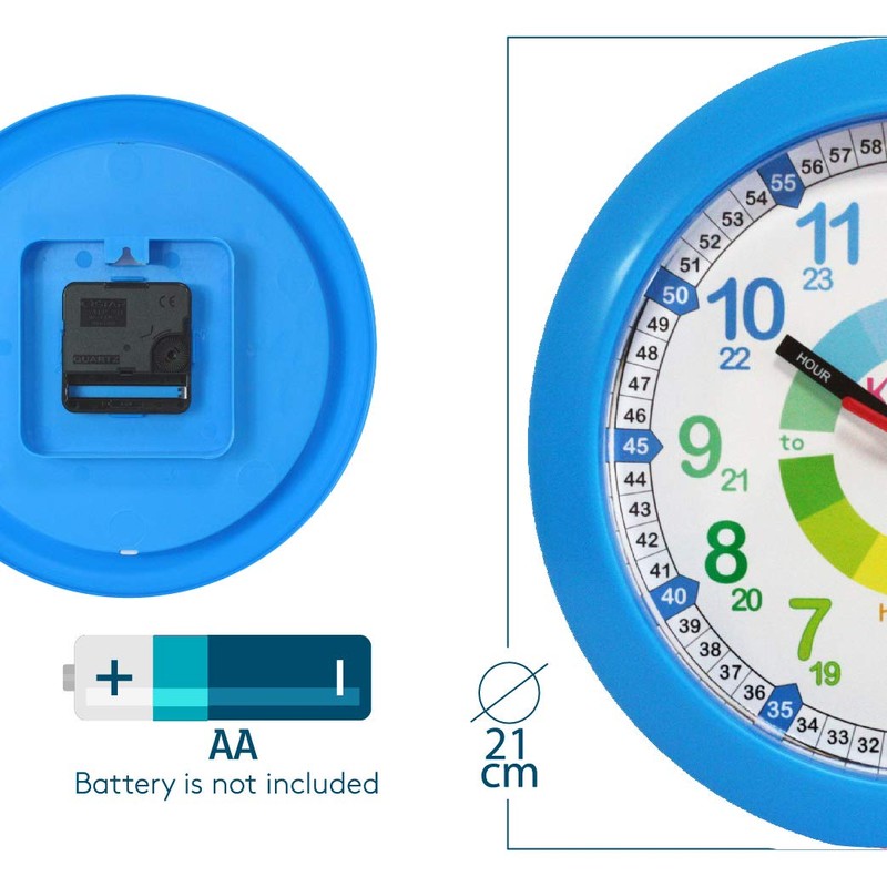 Kiddus Kid’s Wall Clock Analogue Time Teacher with Time Learning Exercises, Silent Clock, Multiple Languages, English, Blue