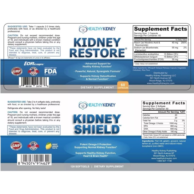 Kidney Restore was built to address 5 factors that are essential for total kidney support in the modern-day while Kidney Shield kidney capsules give you the two omega-3 fatty acids—in precisely the correct quantity and ratio—that promote and support a healthy inflammatory response in the kidneys plus more.