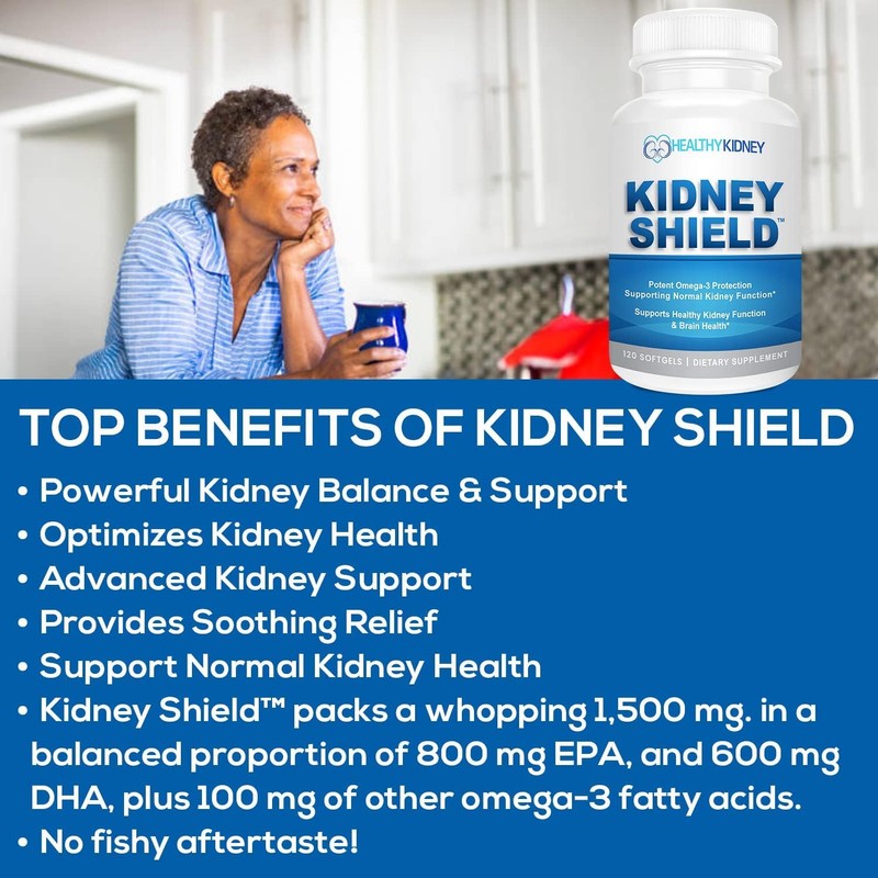 - This product is the right ratio of EPA & DHA the two most potent and important omega 3 essential fatty acids for overall kidney function support and renal restoration. To equal the potency of the EPA & DHA content of Kidney Shield, you'd need to take about 6-8 pills a day of others, with ours you only need 2. Plus, this kidney supplement has no fishy taste with the essence of lemon and rosemary