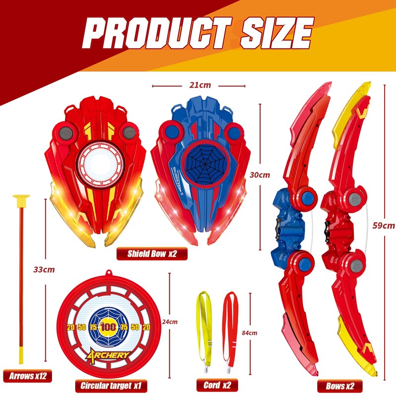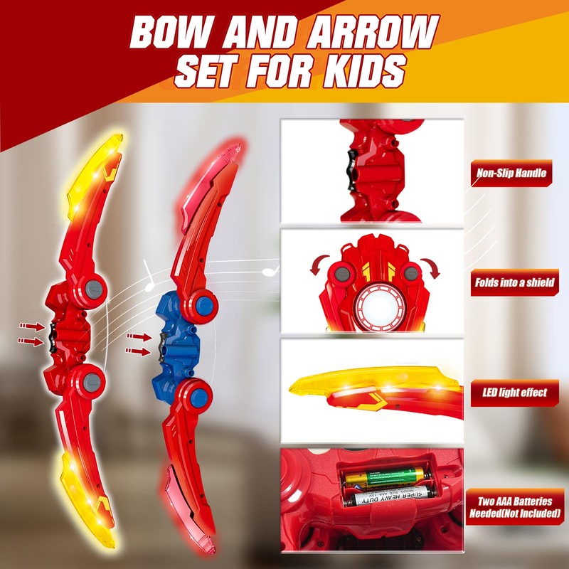 - VALUE ARCHERY KIT: LED light up archery toy package includes 2 bow bodies, 12 suction cup arrows, 1 target. Each bow requires 2*AAA batteries (not included). Two player competition adds to the game experience. A great toy for 4 5 6 7 8-12 year old boys.