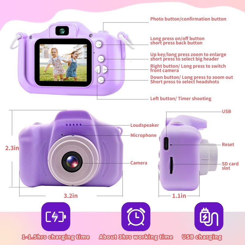 - Idea Gift Camera for Kids:Children's camera will coming with a cute case. Which will provides effective anti-fall, it makes the toy camera more safe and durable.In addition,package included a durable lanyard for children to hang the camera on neck.This child's camera includes:Kids Camera×1,32 GB SD Card×1,SD Card Reader×1,USB Charging Cable×1,Protective Case×1,Lanyard×1,User manual×1. Perfect gift choice that combines fun, creativity, and learning
