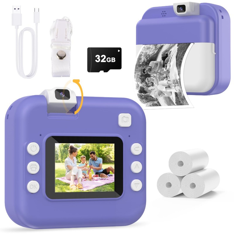 Flip Lens for Easy Dual Selfies: Our mini print digital camera features a unique flip lens that lets kids easily switch between front and rear cameras—no complicated buttons needed! Perfect for selfies or regular shots. Package includes: 3 photo paper rolls (1 pre-loaded + 2 extra), USB cable, 32GB SD card, neck strap, and user manual
