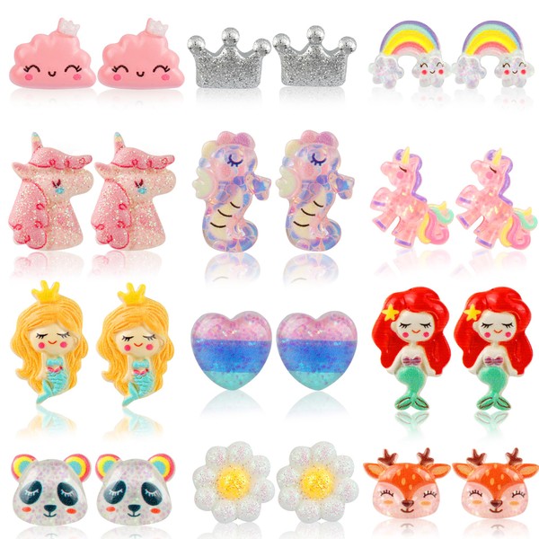 Kids Clip On Earrings for Girls Ages 4-12 Hypoallergenic, Sunxiner Little Girl Cute Small Clip-On Earrings Jewelry Gifts Set (12 Pairs)