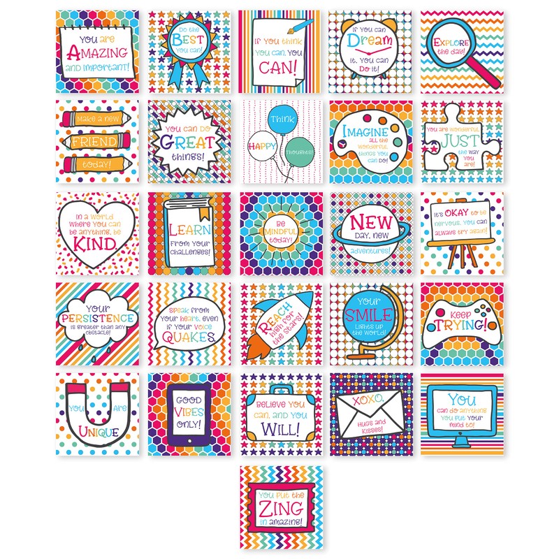 Kids Kind Cards Lunchbox Notes are a colorful way so send a little encouragement! Each note card is 3" x 3" and the back is blank for you to add a personalized message. The set includes 52 cards (2 each of the 26 alphabet designs) which focus on daily uplifts and inspirations.